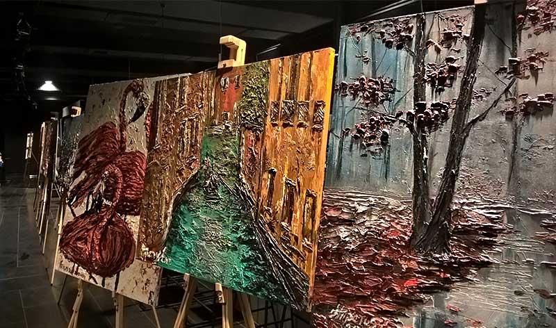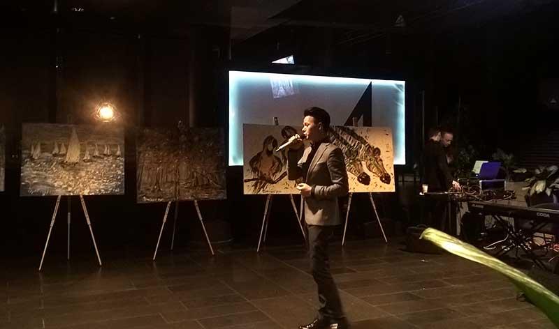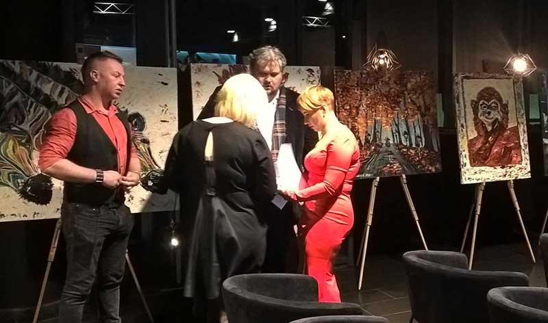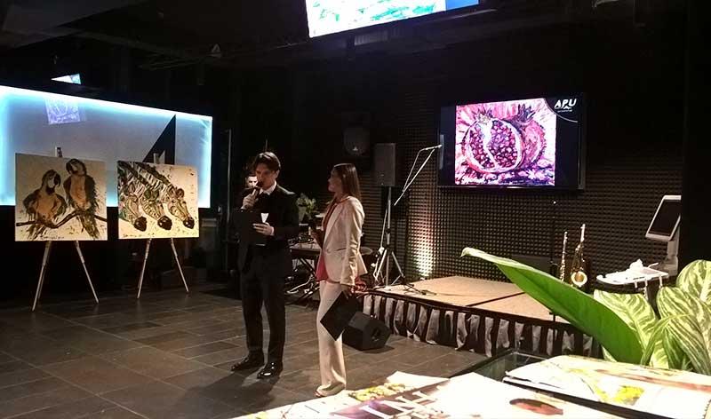 На расставленных мольбертах по периметру всего зала экспонировались работы Ирины Третьяк, что позволило гостям ознакомиться с шедеврами еще до начала аукциона. Гости охотно общались с художницей и другими участниками благотворительного мероприятия.